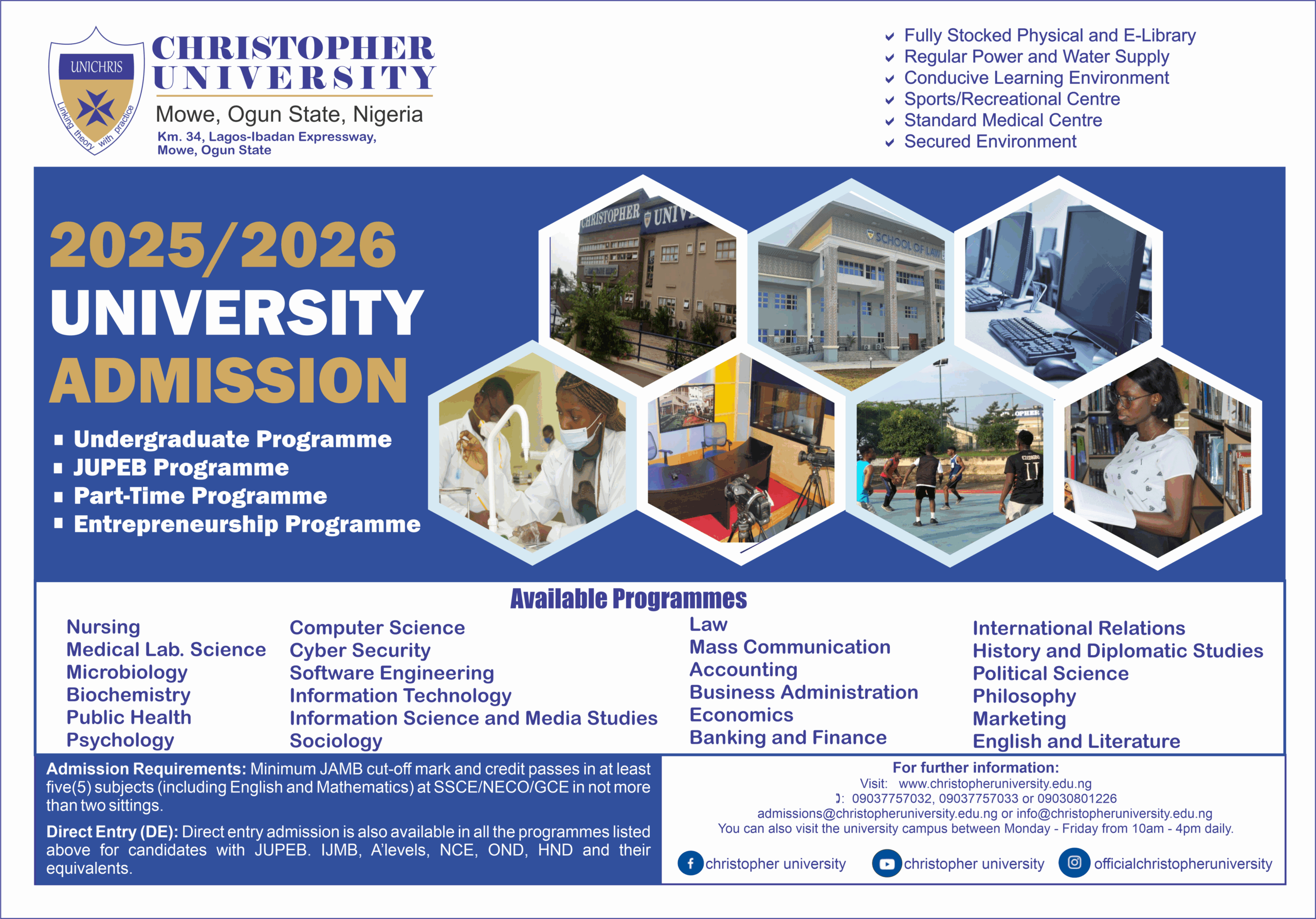 info@christopheruniversity.edu.ng, admissions@christopheruniversity.edu.ng